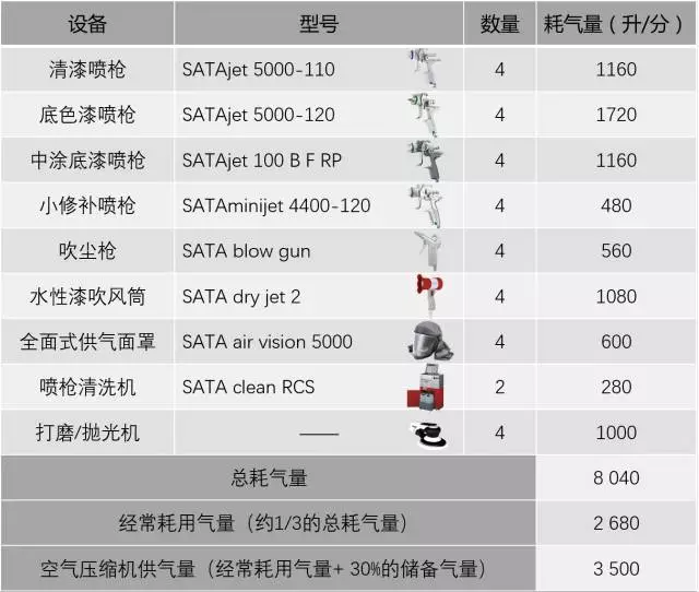 空氣壓縮機的設備銘牌上都有功率和排氣量這兩個(gè)參數,一般1 千瓦的螺桿式空氣壓縮機的產(chǎn)氣量為120 升/分~150 升/分,不同品牌和型號空氣壓縮機的參數也不盡相同,可根據空氣壓縮機廠(chǎng)商提供的數據來(lái)選擇。如果按照職業(yè)院校鈑噴實(shí)訓車(chē)間布置2個(gè)噴烤漆房和4個(gè)前處理工位,則應該選擇30 千瓦的螺桿式空氣壓縮機,其排氣量大于3500 升/分。
