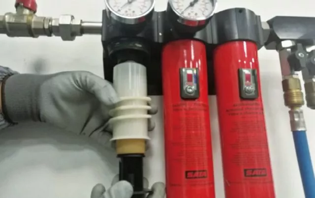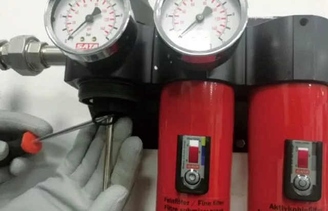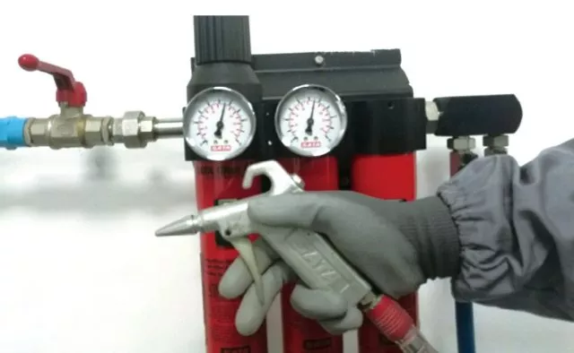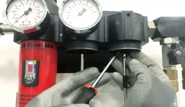 1. 關(guān)閉氣源,讓系統減壓??墒褂么祲m槍幫助完成,直到壓力表顯示值為0巴時(shí)才可拆開(kāi)油水分離器。