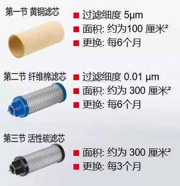 特別提醒:第二節纖維棉濾芯的使用期限是6個(gè)月,第三節活性碳濾芯的使用期限是3個(gè)月,這兩種濾芯不能清洗,只能更換。